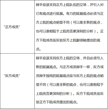 除了两方最后一位辩手(正方和反方党鞭),其他所有辩手都应引入新的论据和材料(但并不须是新观点)。除了首相,所有辩手都应反驳对方辩手的观点。
