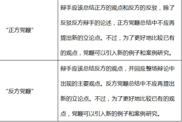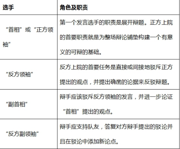 每个辩手都有特定角色且每段发言都须有明确具体的目的。下面列出的辩手角色及职责可提供借鉴,但比赛中的辩手角色既不仅限于此,也并非皆须面面俱到。由于具体辩论情况不一,在正方支持辩题、反方驳斥辩题的前提下,辩手可能会完成设定角色以外的任务,其发言也可能不仅限于以下陈列的目的。