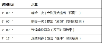 每位辩手的发言的时间均为7分钟。辩手提出“质询”的时间应在发言人讲话的第2到第6分钟之间。