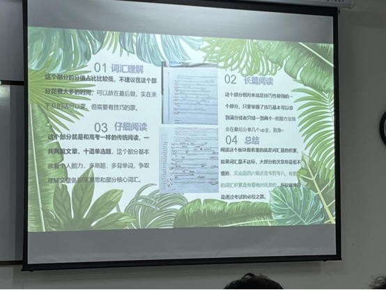 在第三个环节,英语2303班朋辈导师白炜煜同学准备了关于四级考试的大量“情报”,把自己一次性通过四级考试的“锦囊妙计”传递给同学们。白炜煜讲解了大学英语四级考试的题型和分值分布,分板块、分题型地为学弟学妹们讲解备考时自主训练的方法和考场里的做题技巧。他还慷慨地向同学们分享了自己备考四级时所听网课的博主名单,分享课外读物、习题和用于记背单词的APP。最后,朋辈导师强调了多做四级真题的重要性,建议同学们踏实备考,强化基础能力,多泡图书馆,多背单词。他干货满满的分享引得台下同学们不断举起镜头,拍下感兴趣的信息。