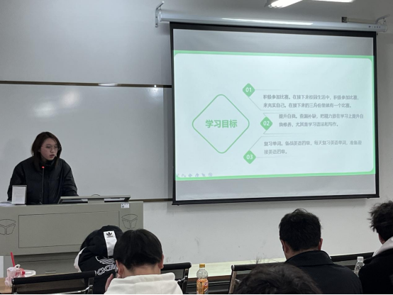 优秀学生代表沙辰峰、程雨婷同学给大家分享了新学期的学习计划。沙尘峰同学向同学们推荐“词根词缀法”背单词,达到举一反三的效果。同时,他提到自己除了专业学习,还开始接触申论写作,为将来考公做准备。程雨婷同学在介绍学习计划时,着重强调了参加学科竞赛的重要性和益处。“以赛促学,以赛助学”。她建议同学们通过积极参加学科比赛来增长眼界、学以致用,实现自我充实和自我提升。两位同学的分享为同学们设立自己的新学期目标提供了新的思路。