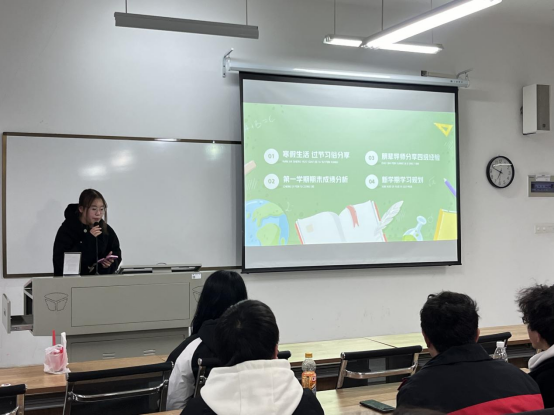 “开学大动员”班会分为四大板块,分别是:愉快的假期生活回顾、第一学期期末成绩分析、朋辈导师分享大学英语四级备考经验和展示优秀同学新学期学习计划。