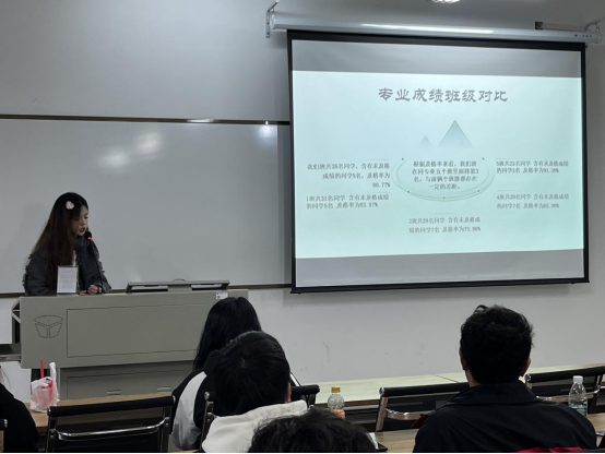 接着,学习委员赵倩曼同学走上讲台,为大家量化了第一学期期末成绩分析。首先,赵倩曼从数据入手,肯定了2303班同学们在《英语阅读》中的突出表现。同时,她也指出了有同学不重视网课学习和线上考试要求,导致错过考试时间,影响了平均成绩。其次,赵倩曼同学将英语2303班专业成绩与英语系其他班级进行横向对比,犀利地点出本班同学的平均绩点在年级中尚处中等偏下水平,提醒同学们在新学期端正态度,摆脱浮躁情绪,踏实求学。