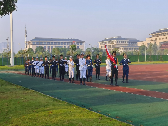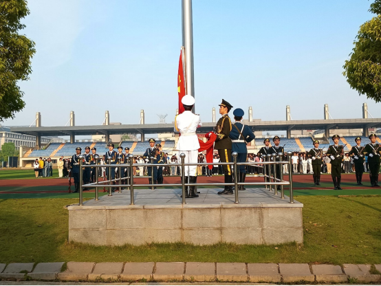 清晨,伴着嘹亮的口号,国旗护卫队迈着铿锵有力的步伐,护卫鲜艳的五星红旗入场。在雄壮的国歌声中,五星红旗冉冉升起,全体师生庄严肃立,面向国旗,齐唱国歌,行注目礼。