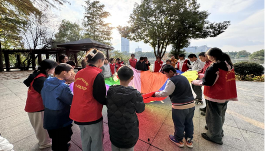 活动初期,志愿者们依然遇到了不少挑战。孩子们或沉浸在自己的小世界里,或对志愿者的热情表示回避。然而,志愿者们并未因此气馁,他们凭借无尽的耐心和温柔的话语,逐渐拉近了与孩子们的距离。在教室里,志愿者们耐心地引导孩子们参与运动,课间休息时,花园里充满了孩子们的欢声笑语。彩虹伞在阳光下旋转,孩子们紧紧抓住伞边,欢快地跳跃,而志愿者们则在一旁细心陪伴,确保每个孩子都能享受到游戏的乐趣。