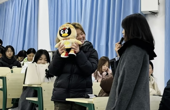 寓教于乐,击鼓传花开启新篇章。辅导员陈惠紫老师创新设计“击鼓传花”互动暖场,巧妙融入心理激励元素,鼓励学生打破社交壁垒,主动把握机遇,现场欢声笑语。“击鼓传花”作为传统游戏,在此次班会中被赋予新的意义。陈惠紫老师以武院幸运物——限量版QQ公仔为传递纽带,在轻快的音乐中,公仔随机抛向主动张开双手的同学。规则设定充满深意:唯有勇敢伸出手的同学,才有机会接住这份“幸运”。接到公仔的“幸运儿”不仅可以收获陈老师精心准备的礼物——象征逢考必过的“文具套装”、缓解压力的“按摩爪”“蒸汽眼罩”、倡导健康生活的“跳绳”“干发帽”,以及满载童趣的旺仔牛奶,更被赋予“传递幸运超能力”,将幸运公仔随机抛给下一位主动伸手的同学。