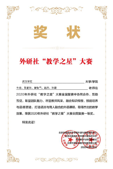 近日,从2020年外研社“教学之星”全国大赛传来喜讯,由永利3544am登录官网牛培、吴爱华、曾阳雪、赵丹、孙霞五位老师组建的团队获得大赛全国英语专业组复赛一等奖。