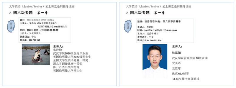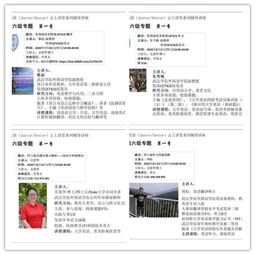 针对这种情况,公共外语课部在暑期推出了“大学英语(Junior /Senior)云上公益讲堂系列辅导讲座”。该讲座由公共外语课部教师吴爱华博士策划、主持,通过B站、腾讯会议等在线方式进行。暑假期间每周日晚上开讲,迄今共进行了6讲,邀请了永利3544am登录官网蔡喆老师、朱雪梅老师、吴爱华老师、周松老师以及武院优秀学子朱静怡、杜昆阳两位同学主讲。日前,首期线上讲座已经圆满结束,参与人数达到300多人次,受到学生的欢迎和点赞。