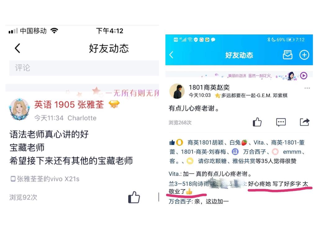 对于老师们的辛勤付出,英语1904班陈月星同学说:“今天的线上课给我带来了全新的新鲜感和满足感,也为我们提供了新的学期起点。线上学习可以显示知识的动态画面,还能方便地调用图标、文字、图片,使教学达到了一种新的境界,新颖的教学形式深深地吸引了我们。但是在疫情面前,我们要不负期望,认真听好每一堂课,全身心的投入到新学期的学习中去,这是对自己负责,也是对老师们辛勤成果的回报,更是对社会、对国家最大的支持。”老师们课后之余,对如何保证课堂效果也展开了激烈的讨论,有的老师分享了慕课堂存在的问题,课堂效果比较好的老师赶紧推荐了QQ屏幕分享, QQ群课堂,腾讯课堂等平台和方法,还没有上课的老师急切咨询好的教学平台使用方法。