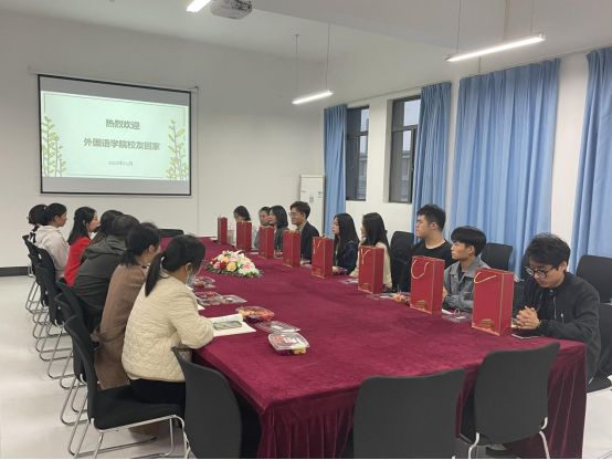 校友们畅所欲言,大家在欢声笑语中,分享着自己的生活、工作以及学习。校友郑文灿通过总结分享自身读研提出,学习应当注重综合性,可跨界了解多方面知识,要大胆尝试,有清晰的目标,坚持不懈地朝那个目标奋斗。校友罗晨琳以自己的考研经历为出发点,讲述了自己如何应对考研以及如何安排学习,并说到:“英语专业其实也能有很好的出路。”其他几位优秀毕业生们也都一一分享交流了自己近年的学习以及工作的经历和感受,老师们都细心地聆听并给出自己的建议。
