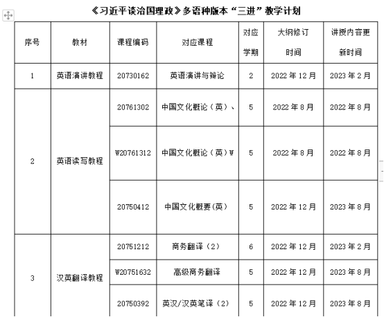 2022年秋季学期起,永利3544am登录官网在英语专业和商务英语专业人才培养方案课程体系中,全面实施《习近平谈治国理政》多语种版本的《理解当代中国》系列教材,涵盖的专业课程有:英语演讲与辩论、商务翻译、高级翻译、英汉/汉英笔译、中国文化概论(英)、英语阅读、法语阅读、法语翻译理论与实践、日语阅读、日语翻译理论与实践等11门课程。每门课程教学周期为一学期,学时为32学时。