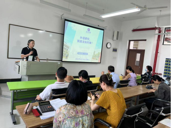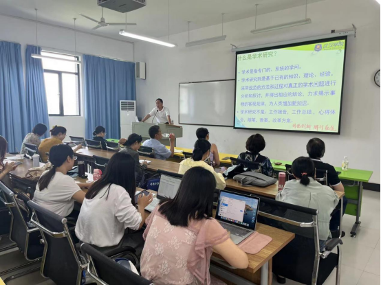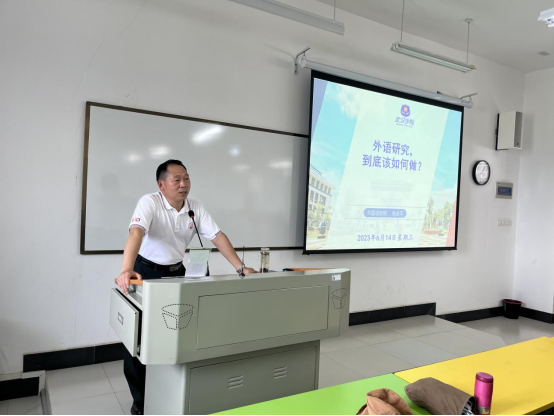 讲座伊始,陈教授基于“科普”的角度,从学术研究的基础知识讲起。他首先为全体教师阐释了“学术研究”的基本定义,并与“工作成果和相关总结”进行区分,强调学术研究的三要素:“具备研究基础”、“使用规范方法”、“回答学术问题”。随后,陈教授一一阐释了学术研究的特点、如何获得学术研究问题,并介绍了现今高校外语科研的两大方向:“专业研究”和“教学研究”,强调“教学研究”在当今外语研究中的上升趋势。