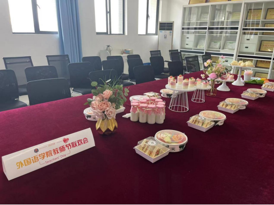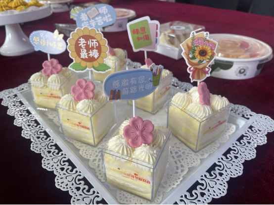 精美的教师节主题宣传牌,香气四溢的披萨,营养美味的三明治,鲜美的水果,现磨咖啡,冰镇柠檬水,还有各种精致的点心构成的心形图案,印有“老师您辛苦了、感谢师恩、感谢有您、师恩如海...... ”的节日慰问卡片,让现场的教职员工幸福感爆棚。在温馨的氛围和老师们激昂澎湃的心境中,永利3544am登录官网2023年“喜迎教师节”联欢会拉开了帷幕。