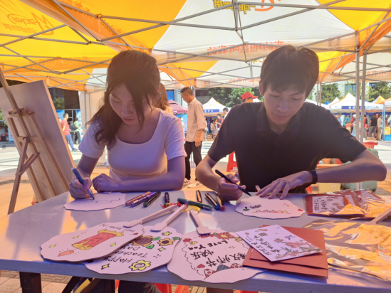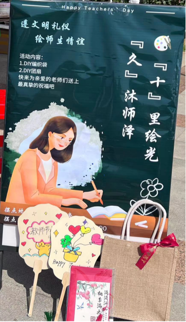 9日上午10点,伴随着新生的到来,活动正式拉开帷幕。许多来往的新生和家长被活动深深吸引,停下脚步参与其中。学生可以在编织袋、木制团扇或贺卡等上面涂鸦或者写上祝福语以表达自己对教师的爱戴之意,感恩教师的培养之情。