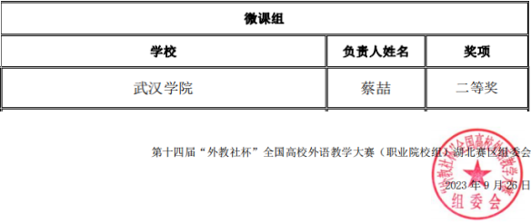 9月26日,经过紧张激烈的角逐,第十四届“外教社杯”全国高校外语教学大赛(职业院校组)湖北分赛区复赛圆满落幕。来自我校永利3544am登录官网的蔡喆老师获得微课组湖北省二等奖。
