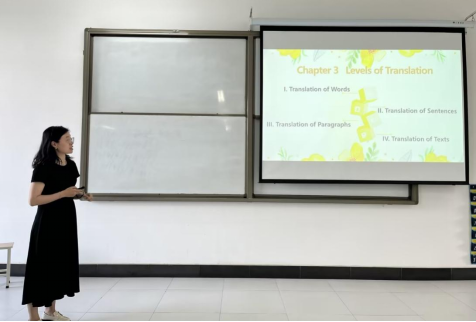 英语系王理老师主要围绕词的翻译展开,介绍了词义的两个层次:指称意义和隐含意义,让学生全面了解词义的构成。通过案例对比,引导学生总结了汉英词义的三种关系:词义相符、词义相异、词义空缺,让学生认识到语言与文化的深层联系。理论与实践结合,通过提问和讨论,引导学生根据不同的词义关系,总结出词汇翻译的方法和技巧。