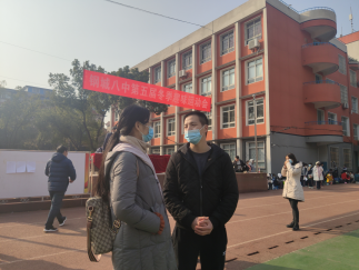 由于八中当天下午正值第五届冬季趣味运动会,实习生担任裁判工作,不能离开比赛场地,教师们就利用比赛空隙和实习生交流实习情况。