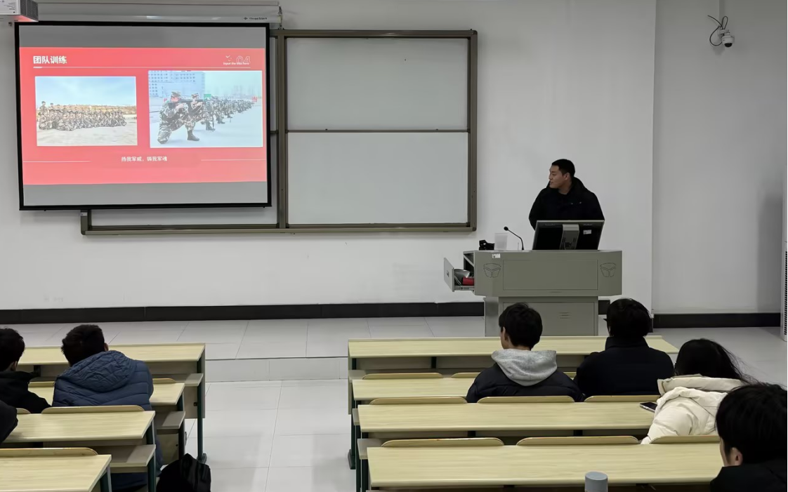 在胡老师讲解完之后,国防协会会长武施宇同学上台分享了他的军旅生活,他叙述了自己在部队度过了难忘的岁月和分享了宝贵的成长经验。从最开始单杠引体向上只能费力拉一个到10米爬绳攀登一口气到最高点,从直升机索降训练到野外露营拉练,从单位会餐到文艺演出,从八块腹肌到退伍离别——他的深情叙述展现了一名新兵从初入军营的不适应,到逐渐融入集体、成长为一名合格的军人,再到退伍后回归校园、继续学业的历程。这种亲身历程告诉同学们,军旅生活虽然充满挑战,但提升了身体素质、锻炼了意志品质,让人学会了在逆境中不断成长。