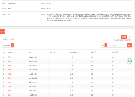 本次比赛依照学生A.I.智能评分+专家人工评分总分由高到底进行排序;在总分相同的情况下,排名参照学生挑战关卡总时长,挑战累计时长较短者 排名靠前。经过一天的激烈角逐,共10位同学在发音准确度、完整度、流利度和语义表达四个方面脱颖而出,展现了优秀的英语口语能力,获得参加湖北省复赛的资格。本比赛为学生提供了展示英语口语水平的平台,激发了全校各专业学生英语学习兴趣,同时也进一步提升了教师的信息化教学能力,践行了以赛促学、以赛促教。