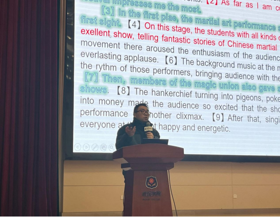 紧接着,蔡喆老师为同学们归纳总结了写作中的得失分要点。重点强调结构在规定的位置上出现对应的语句内容,并以题目为例,进行实操,详细讲解了总论点、分论点及论据的结构要点和逻辑关系,提出作文结尾要与开头相呼应,用升华句提高文章的温度的一般语句范式。然后,蔡老师结合具体的范文和评分标准,对2023年12月的英语四级真题进行了深入解析,详细讲解了真题的写作要求、解题思路,并通过不同档次的得分范文分析出同学们行文中的失分和得分要点。蔡老师提出了四点建议:不要模板;行文不求有功,但求无过;整理对应逻辑词;目标定为11分。
