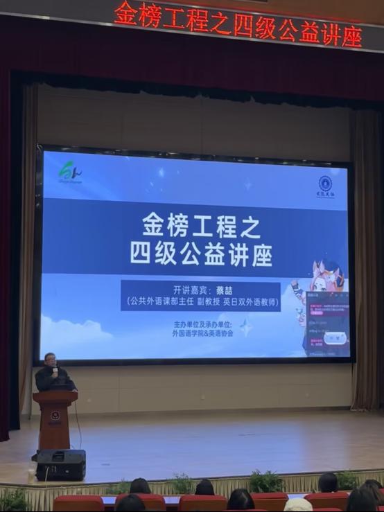 永利3544am登录官网与英语协会于2023年12月22日下午六点半在刘炽平报告厅成功举办了“金榜工程之四级公益讲座”,旨在对2023年12月的真题进行深入解析,帮助同学们更好地理解英语四级写作的考题要求,掌握有效的大学英语四级写作得分技巧。本次讲座由公共外语课部主任蔡喆老师主讲,同时在B站上进行了同步直播。