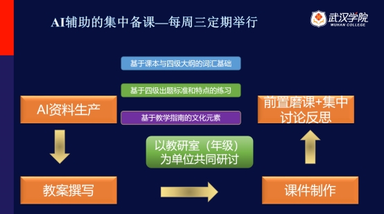 会议还重点讨论了如何将人工智能技术融入教学实践。与会教师一致认为,AI技术在提高教学效率和创新教学方法方面具有巨大潜力。大家提议利用AI赋能教材内容,为学生提供智能化学习资源,同时结合四六级考试特点,通过AI生成试题和学习材料,将其融入集体备课中,帮助学生更有针对性地备考。教师们还计划针对不同单元的教学内容设计专属AI支持模块,为学生提供多元化的学习体验。