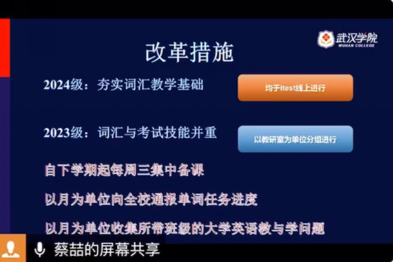 会议伊始,蔡喆主任从教学方法和路径、教学设计、00后学生学习需求及性格特点,以供给侧的角度全面阐述了目前公共外语部教师大学英语教学中存在的问题和面临的挑战,并结合学生学习动机和目前学校对大学英语四级通过率稳步提升的现实要求,从教学设计、课堂管理及资源整合等多个方面详细展示了下一阶段英语教学“团队化、模块化、智能化”的教学改革方案。他强调,大学英语四级考试通过率的提升并不是教师“各自为政、单打独斗”的传统教法,作为“智能+”时代下的教学命运共同体,大家应该以“基于AI大语言模型的集体备课+磨课”为主导思想,群策群力,分工协作,互通有无,实时反馈,在不断地学习和反思中提升自己的教学能力。