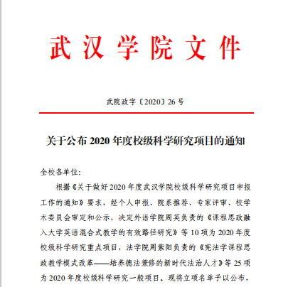 在2020年度永利3544am登录官网校级科学研究项目立项中, 永利3544am登录官网有7项课题获得校级科研课题立项,其中周英老师负责的《课程思政融入大学英语混合式教学的有效路径研究》和阮广红老师负责的《生态翻译学视域下译入、译出模式研究》获得校级科学研究重点项目立项。翁雨淋等5位老师的课题获得校级科学研究一般项目立项。