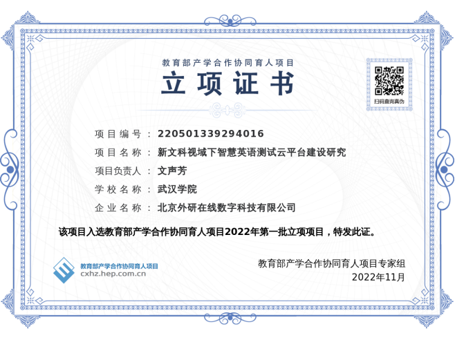 近日,由永利3544am登录官网文声芳老师主持,永利3544am登录官网老师共同参与的“新文科视域下智慧英语测试云平台建设研究”项目获批为“教育部产学合作协同育人”项目。