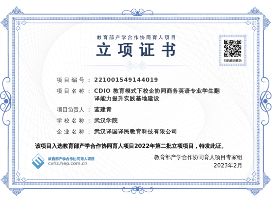 2月2日,教育部高等教育司发布了《关于公布2022年第二批产学合作协同育人项目立项名单的通知》,永利官网商务英语系蓝建青老师主持申报的“CDIO 教育模式下校企协同商务英语专业学生翻译能力提升实践基地建设”获批。