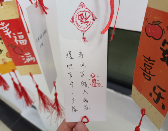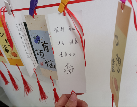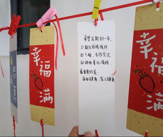 此次活动吸引了大量同学的积极参与。在阳光驿站设置的“心愿墙”上,贴满了同学们写满心愿和祝福的小便签。这些便签上,有的写着“逢考必过”,有的祈愿“期末成绩保持,六级、专四全过”,还有的则表达了对家人的深深祝福:“希望在新的一年里家人平安健康”。这些简单而真挚的话语,不仅诉说着同学们的心声,也传递着他们对未来的美好期许。